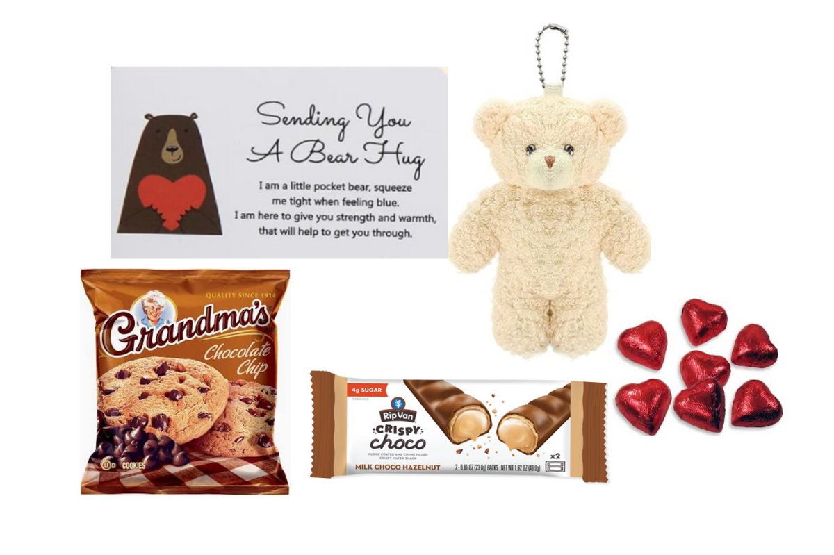 The Bear-Hug Box is a thoughtful gift that delivers warmth and sweetness together. It includes a cuddly bear, a heartfelt positive note, and a package of classic chocolate chip cookies. Perfect for brightening someone's day, this combination offers comfort and a delicious treat in one convenient package.
